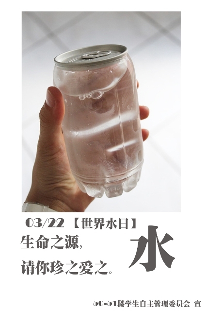 3月17日,50-51号楼宿管会为迎接3月22日“世界水日”的到来,在楼内进行了一次主题为“节约用水,人人有责”的节水宣传活动,楼内同学们都积极参与了此次活动,监督部的成员还对楼内用水情况进行了全面检查。本活动除了前期进行了海报宣传之外,也在微博平台上进行了大规模对点宣传,使得活动取得了很好的效果。